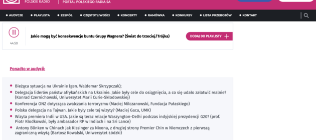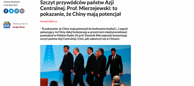 On May 21, 2023, Prof. Dominik Mierzejewski took part in the broadcast "Srodek od środka" on Polish Radio 24. The conversation with Rafał Tomański concerned the two-day summit of the leaders of five Central Asian countries and China in Xi'an. Prof. Mierzejewski pointed out the connections between the city where the summit took place and the history and the period of the greatest prosperity of the Silk Road. According to Prof. Mierzejewski, the summit was intended to show that China is still active. Therefore it wasn't a coincidence it was organised simultaneously with the G7 summit in Japan. The entire material is available to listen to here.