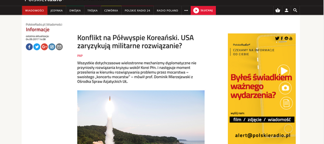 On September 4, 2017, in an interview with the Polish Press Agency, the head of the Center for Asian Affairs at the University of Lodz, Prof. Mierzejewski, acknowledged that negotiations at the United Nations would be crucial in the Korean crisis. Although the Six-Party Talks did not resolve the crisis, the multipolar mechanism based on the Concert of Powers should be recognized as the superior mechanism in resolving the nuclear standoff. Read more here.